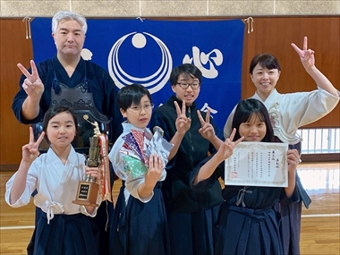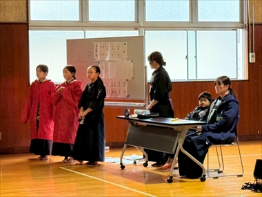 5人1チームによる団体戦 (先鋒 基本組 次鋒 低学年 中堅 高学年 副将 一般女子 大将 一般男子)
